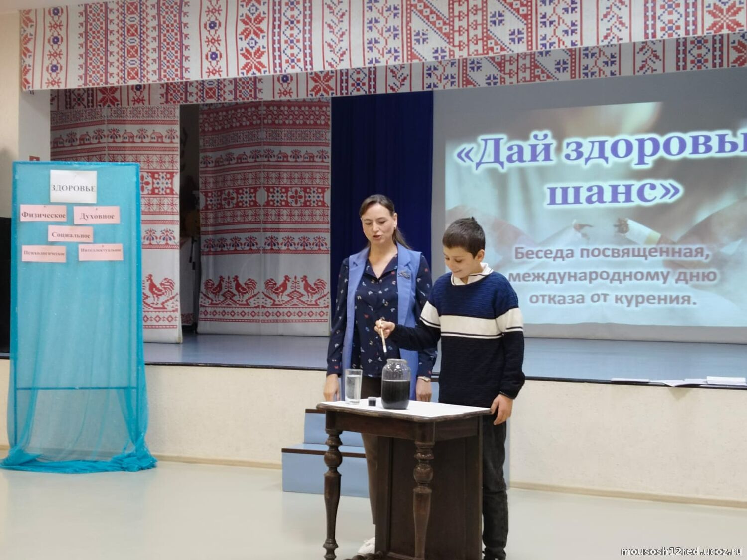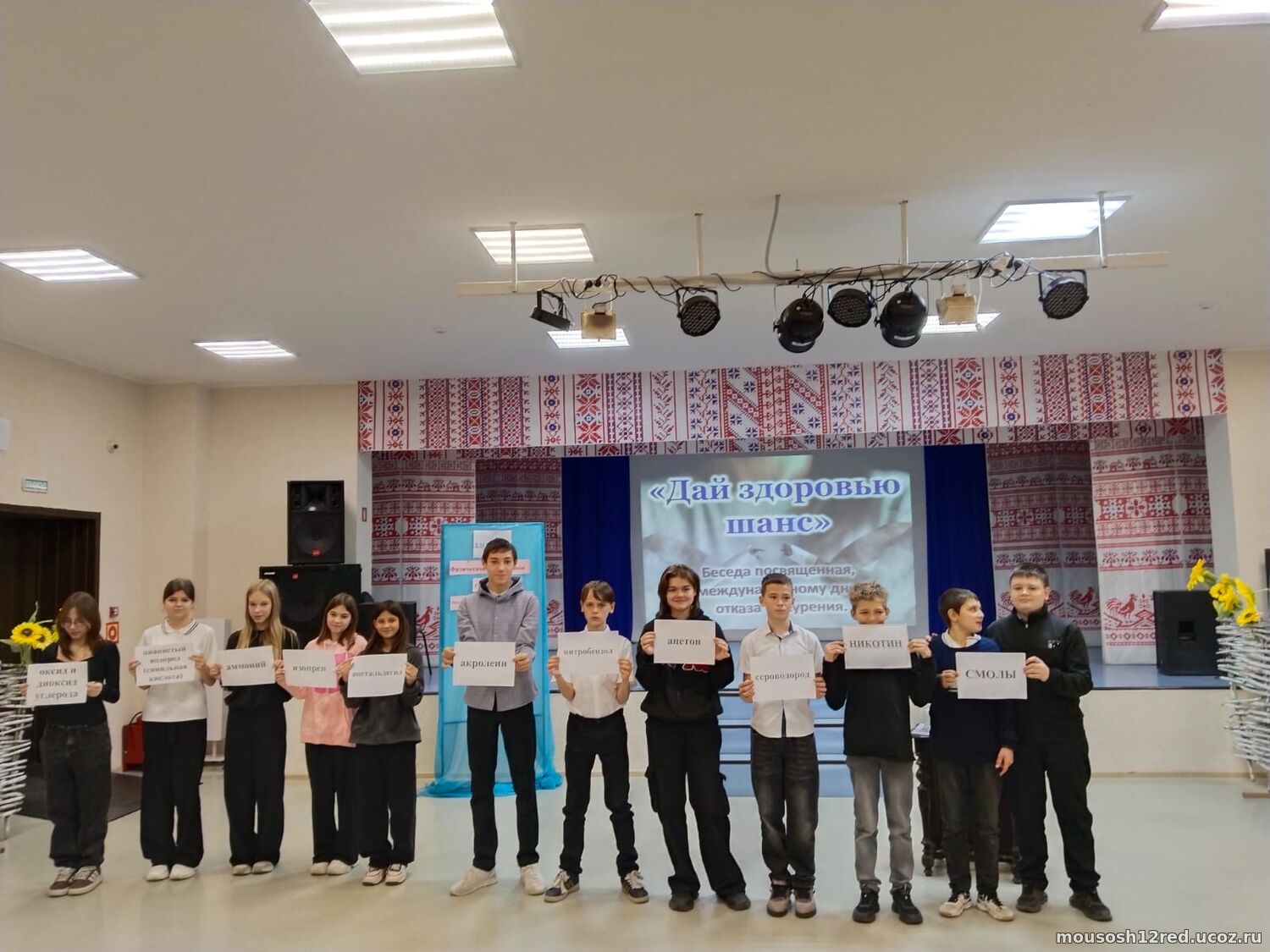 20.11.2025г., с целью привлечения обучающихся к ЗОЖ, в Центре культуры «Дружбы народов» была проведена беседа с обучающимися 7-го класса (охват 32 человека), посвященная международному дню отказа от курения «Дай здоровью шанс». Цель мероприятия заключалась в том, чтобы привлечь внимание детей к пагубным последствиям табакокурения и мотивировать каждого сделать осознанный выбор в пользу своего здоровья. Во время беседы уче