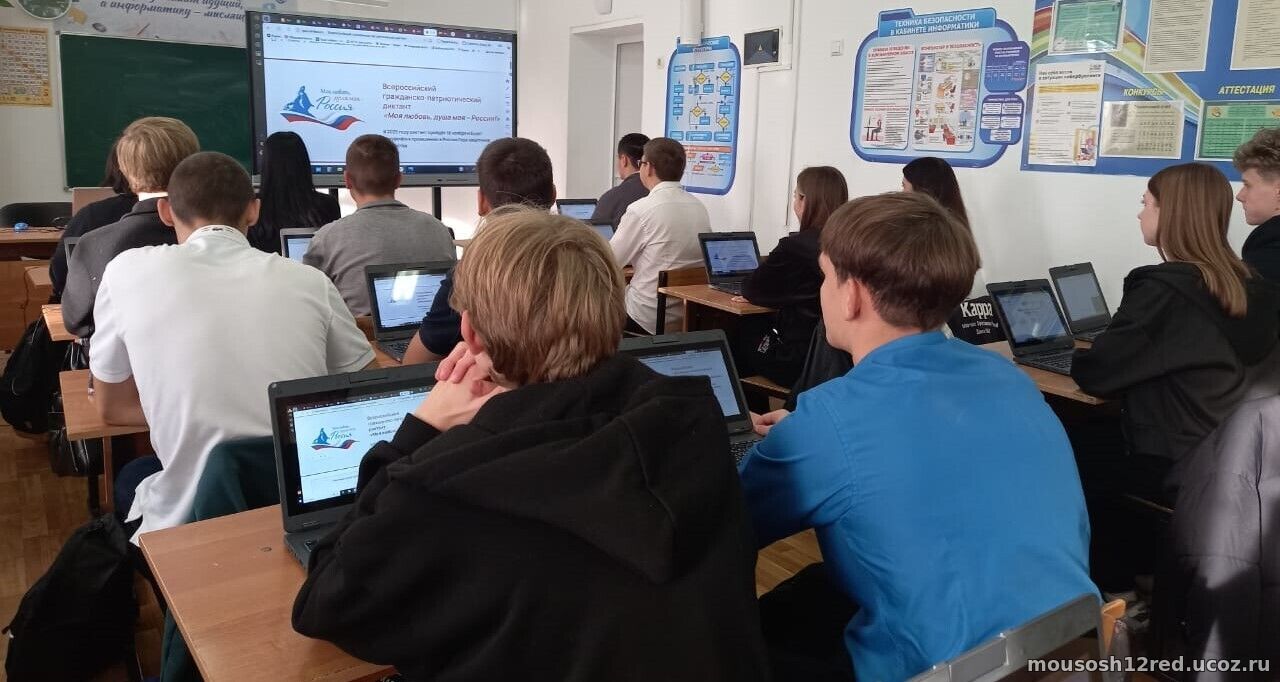 18 ноября 2025 года в нашей школе прошёл гражданско‑патриотический диктант «Моя любовь, душа моя — Россия!». В мероприятии приняли участие учащиеся 10 «а» класса (18 человек).